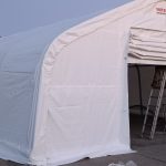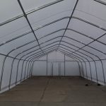 Skladem můžeme mít barevné provedení v bílé, šedé a tmavě zelené barvě PVC textilie. Vjezd o šířce 3m je proveden z kratší, čelní strany. Na koncové, protější straně je proveden požární, únikový východ. Tato plachtová hala má výpočet statiky, požárně bezpečnostní zhodnocení a montážní manuál. Montovaná hala je k dodání ve dvou přepravních boxech. Doprava haly je možná vlastní, taktéž montáž této plachtové haly. V případě zájmu ale můžeme zajistit dopravu i montážní firmu. Nacenění Vám předem sdělíme. Otevření haly je řešeno opět vyhrnovacími vraty s vrátkem. Zadní východ je řešen srolovanou PVC plachtou o rozměru 220 x 130cm.