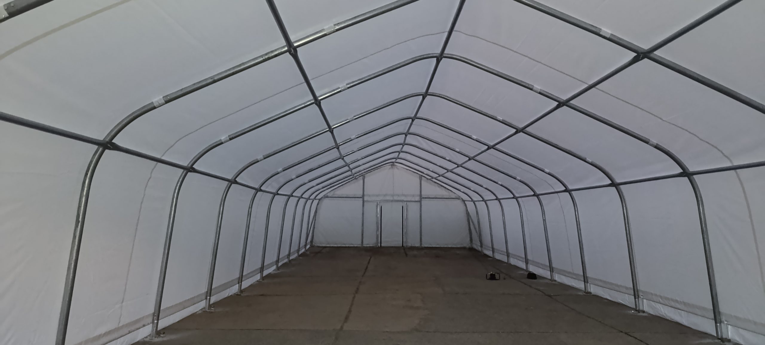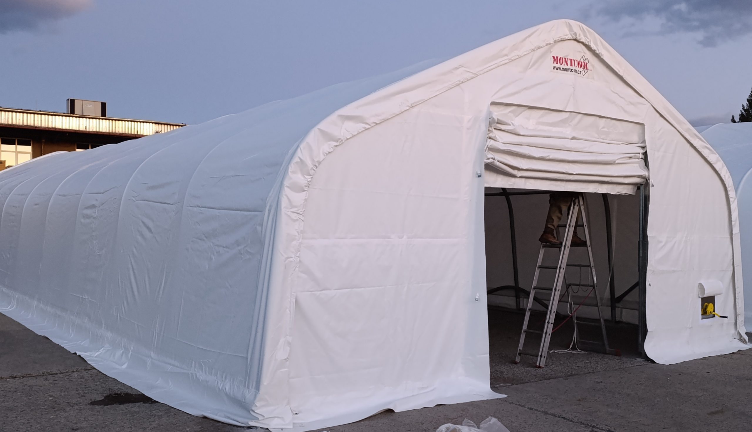 Skladem můžeme mít barevné provedení v bílé, šedé a tmavě zelené barvě PVC textilie. Vjezd o šířce 3m je proveden z kratší, čelní strany. Na koncové, protější straně je proveden požární, únikový východ. Tato plachtová hala má výpočet statiky, požárně bezpečnostní zhodnocení a montážní manuál. Montovaná hala je k dodání ve dvou přepravních boxech. Doprava haly je možná vlastní, taktéž montáž této plachtové haly. V případě zájmu ale můžeme zajistit dopravu i montážní firmu. Nacenění Vám předem sdělíme. Otevření haly je řešeno opět vyhrnovacími vraty s vrátkem. Zadní východ je řešen srolovanou PVC plachtou o rozměru 220 x 130cm.